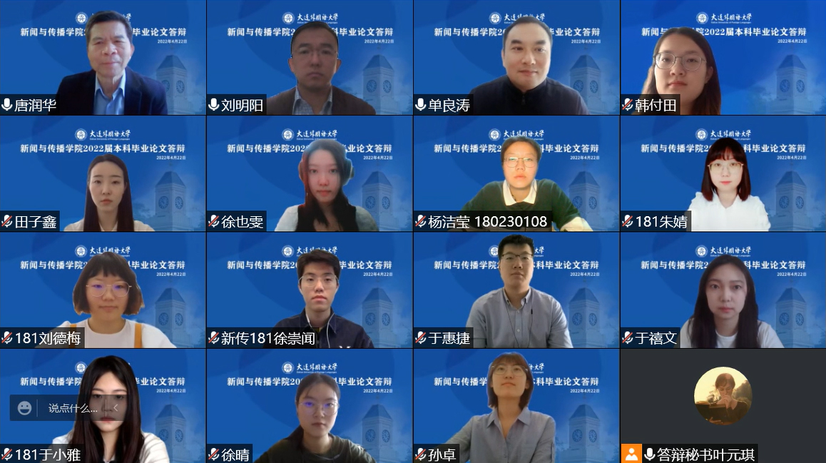 本科毕业论文答辩工作按照既定安排如期进行,本次2018级新闻学、传播学专业58名学生分为5组,采用线上腾讯会议方式进行。毕业论文答辩由学生陈述论文、答辩组成员提问、学生回答问题、答辩组讨论评议、公布答辩结果等环节构成,秩序井然,严肃融洽。