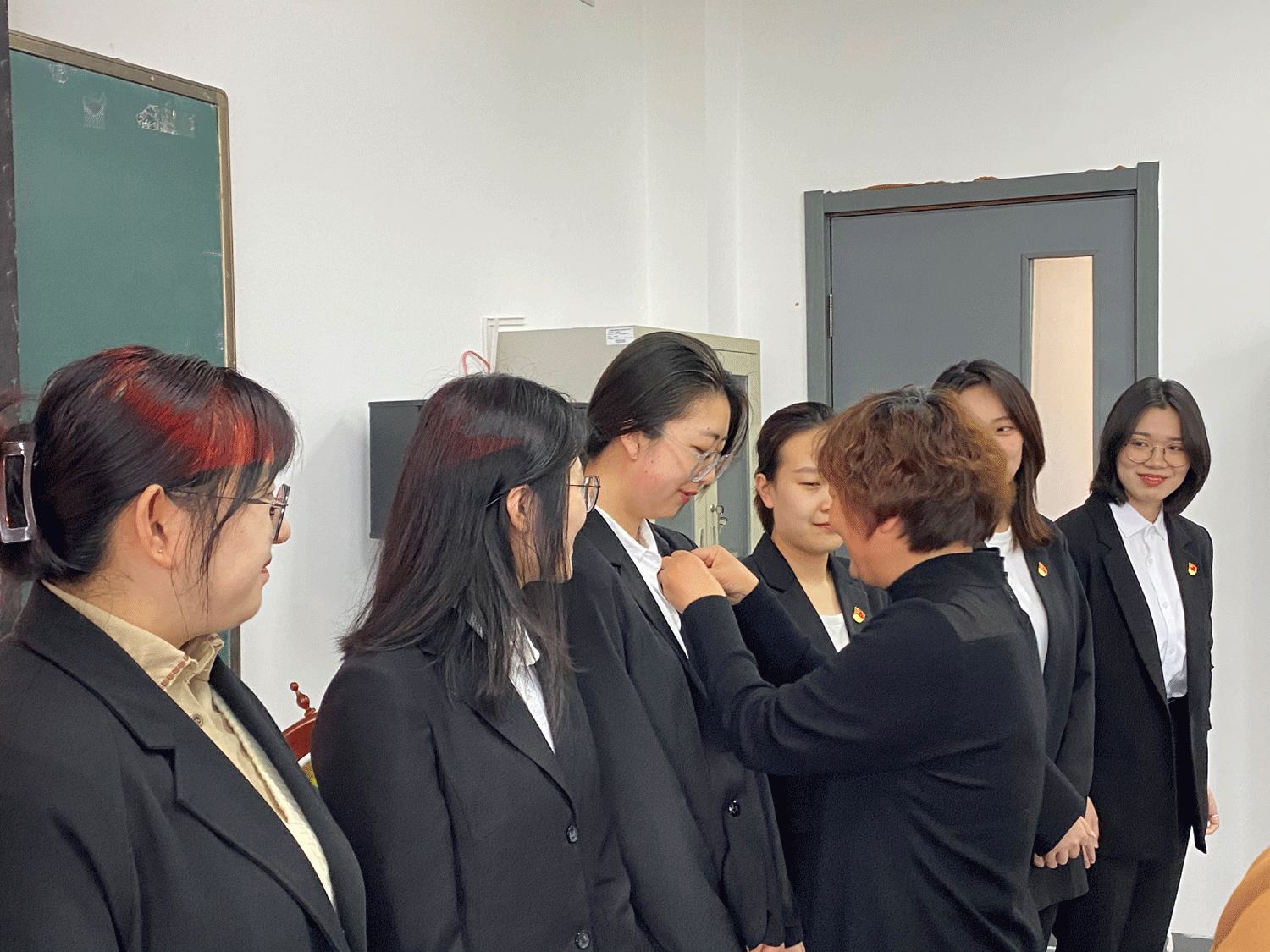 宣誓仪式后,倪春波书记与王琳老师共同为预备党员佩戴党徽,并发放《党员手册》,期望预备党员始终拥有坚定的理想信念,保持优良的政治素养,让青春在党和人民需要的地方绽放绚丽之花。