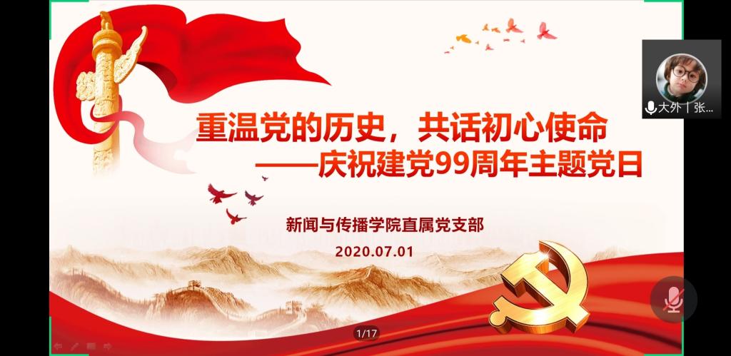 7月1日下午,快乐堂 直属党支部于线上开展“重温党的历史,共话初心使命”庆祝建党99周年主题党日活动。本次活动结合快乐堂 党建创新项目“讲好中国故事,传播中国声音,做党和人民信任的中国故事讲述人”活动,邀请快乐堂 院长、直属党支部副书记张恒军教授、教工党小组组长芦思宏老师做内容分享,2017级学生党员代表雷畅同学发言。快乐堂 直属党支部全体师生党员、发展对象、积极分子参加会议。